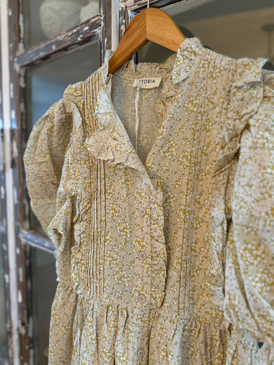 A lovely delicate butter & grey vintage floral cotton dress with pockets and button detail. The dress hits about mid calf, and is perfect for Easter or Sunday church days.